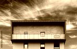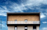 Penthouse with balcony. Modern upper floor apartment with wooden facade, glass windows, minimal