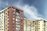 Apartment block housing. Modern residential building with brick facade, balconies, multistory