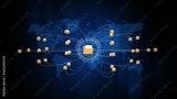 Global data file sharing network showing folders connected over a digital world map, and secure communication. Technology big data digital background. 3d rendering