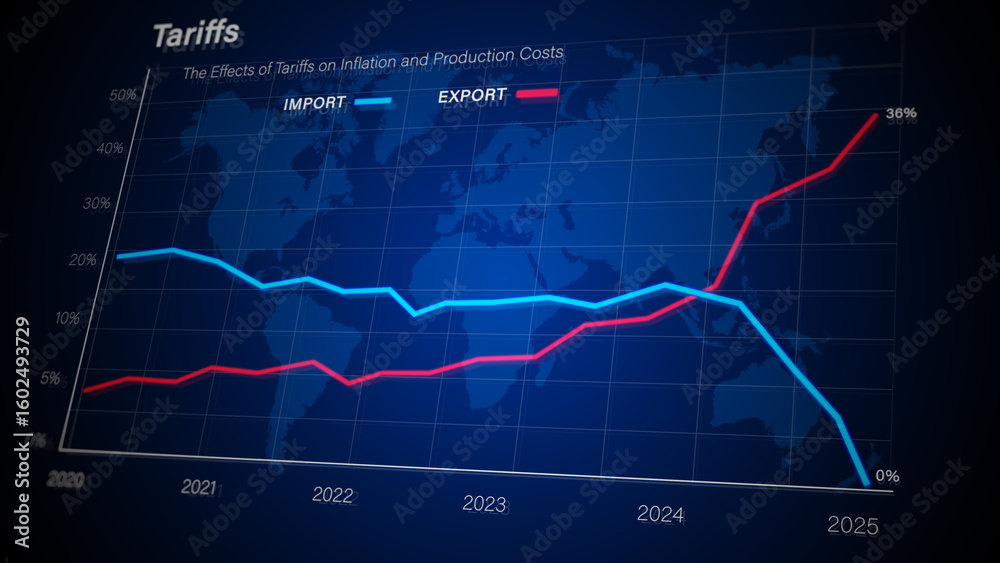 Economic graph showing tariffs impact on import and export costs from 2020 to 2025 with rising and falling trend lines, ideal for finance, trade, and global economy topics. 3d rendering