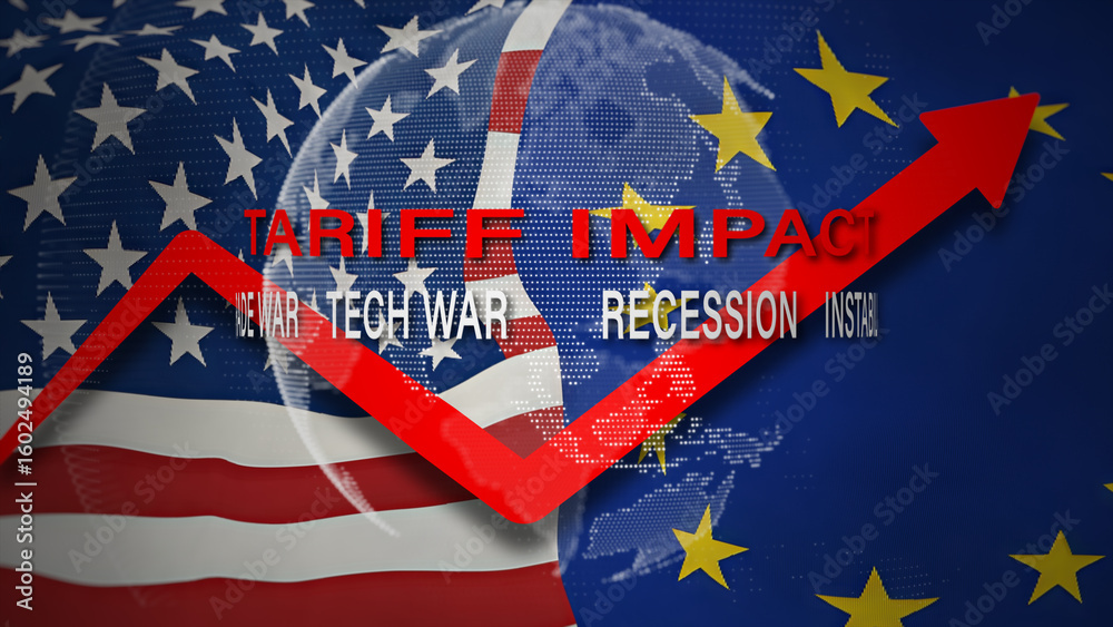 Tariff Impact Between US and EU with Rising Red Arrow and Economic Tensions Like Tech War and Job Losses, Effects on international exports and imports, 3d rendering
