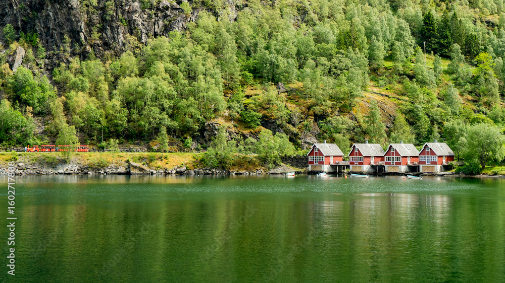 Red boathouses by the Flam fjord with the Flam railway in the background