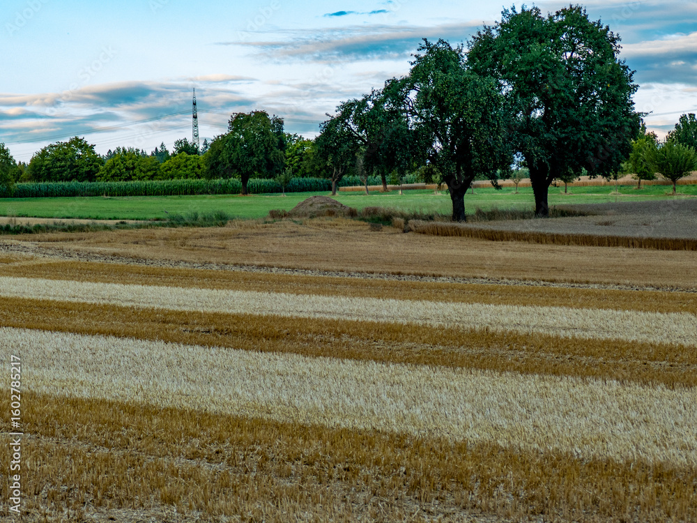 Stark bewölkter Himmel bei Sonnenuntergang über dem Feld