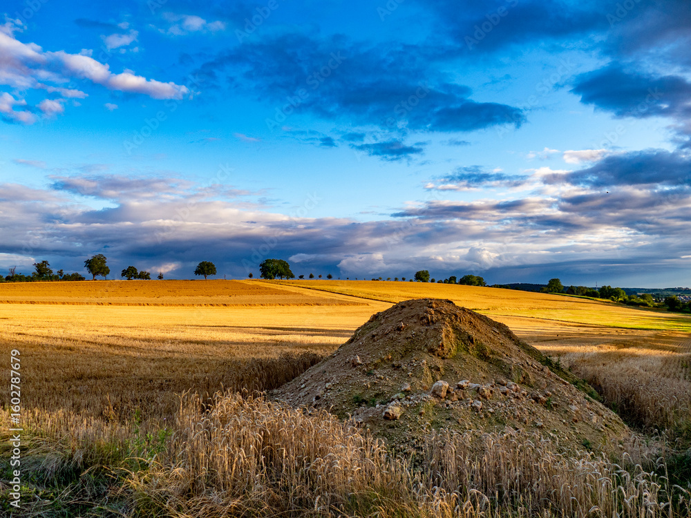 Stark bewölkter Himmel bei Sonnenuntergang über dem Feld