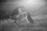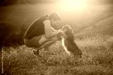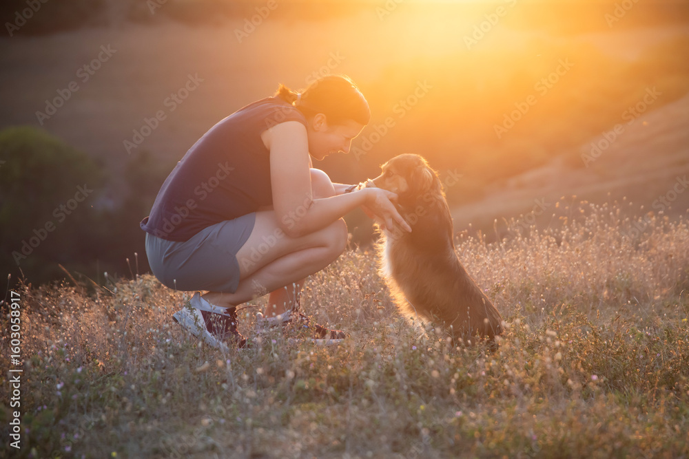 Young woman with her dog playing in the sunset
