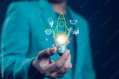 Businessman and rocket start flying up and network line connection. Startup concept Planning and starting corporate business start up, Rocket soars with speed to hit the growth target.