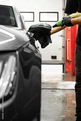 High-pressure air is directed at tight vehicle seams to remove lingering water after washing, helping prevent drips and streaks. Exterior Car Drying with Compressed Air.