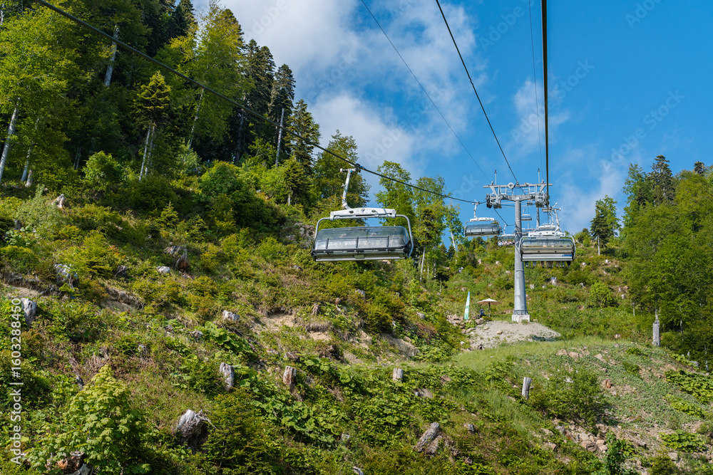 Cabs on the cable car stands against the backdrop of a summer forest and mountain peaks, Rosa Khutor.
