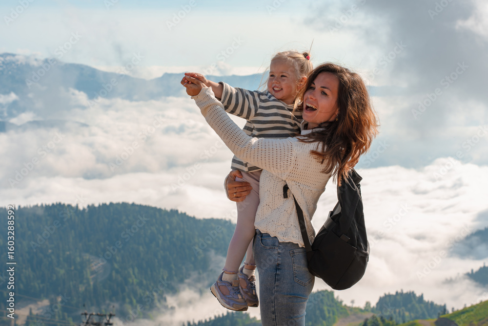 A young mother with her three-year-old child daughter goes to the mountains on Rosa Khutor in Sochi in the summer. The concept of tourism, family holidays
