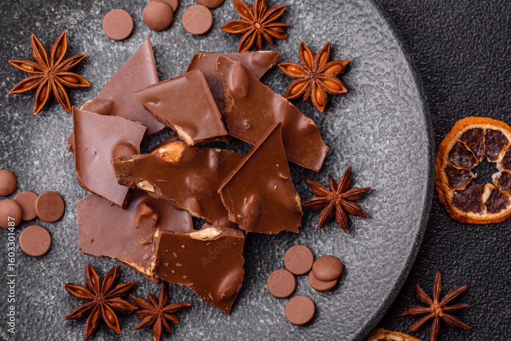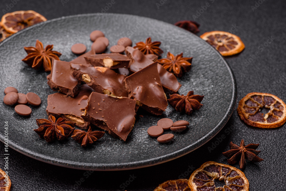 Bar sweet craft artisan chocolate with dried fruits made at home. Craft chocolate