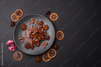 Bar sweet craft artisan chocolate with dried fruits made at home. Craft chocolate