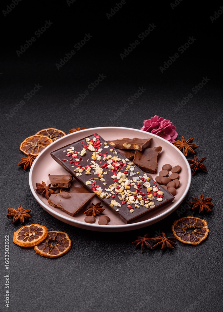 Bar sweet craft artisan chocolate with dried fruits made at home. Craft chocolate