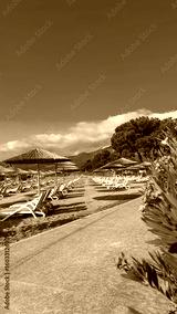 A picturesque beachfront scene features colorful umbrellas, vibrant flora, and lush greenery under clear blue skies, showcasing the natural beauty of this idyllic getaway destination