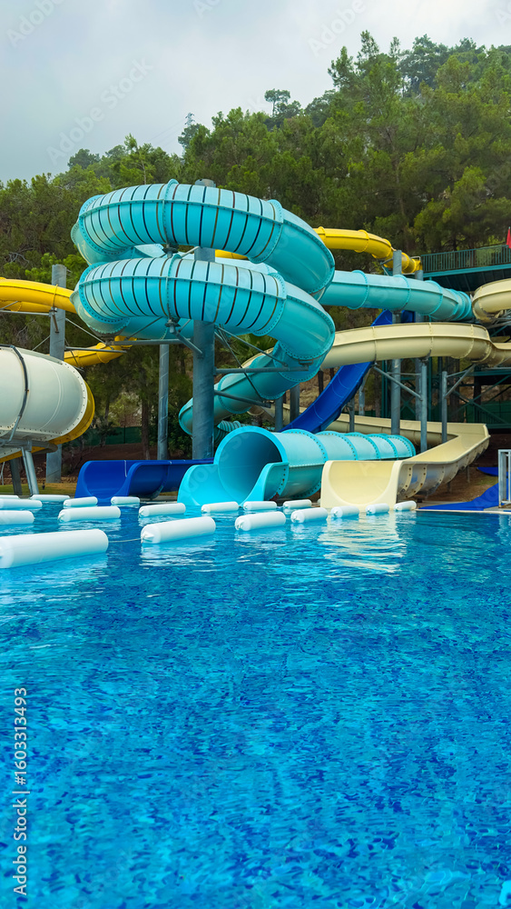 Experience the excitement of thrilling water slides and enjoy the refreshing clear blue pool at an amazing family water park, perfect for a fun and memorable holiday adventure with kids and friends