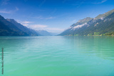 Tranquil views of Lake Brienz with boats and Swiss Alps