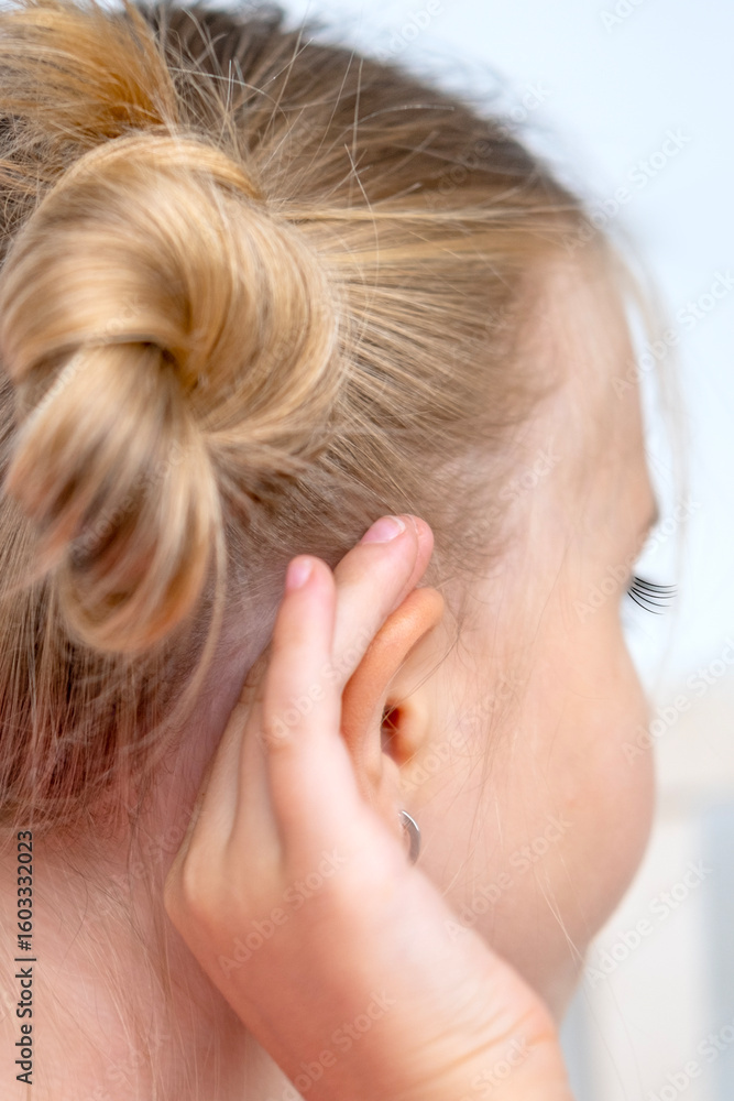 Close-up small child holding sore ear, listening carefully, hearing problem, poor hearing, health issue, attention concept, Ringing, tinnitus, Inflammation middle ear, acoustic trauma