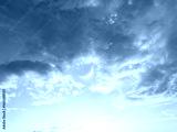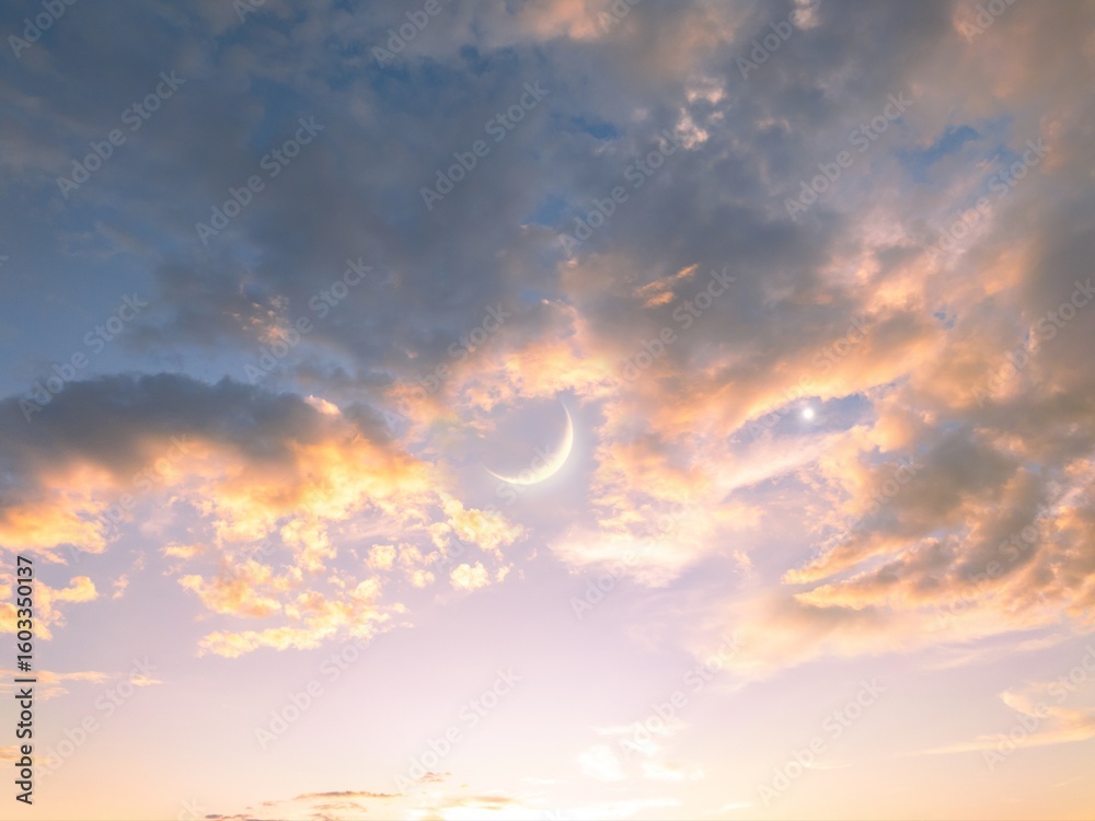 New moon near star Venus in the sky at sunset. Moon and bright planet between clouds. Astronomical landscape.
