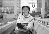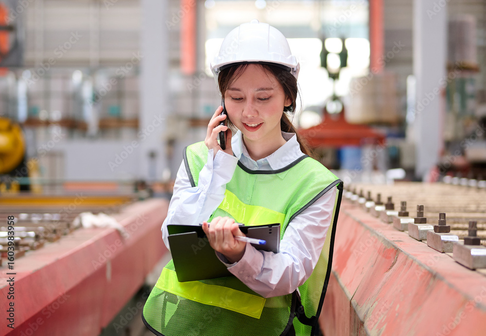 Engineer or worker talking on smartphone and holding a clipboard in the factory