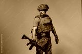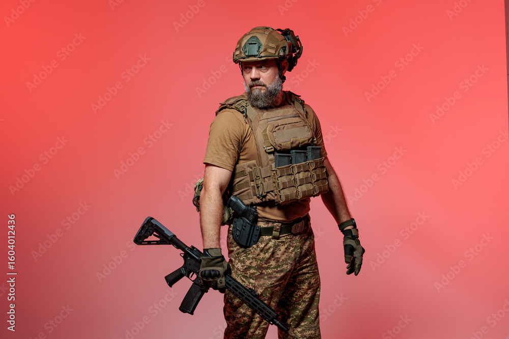 A soldier in military uniform holds a rifle AR 15 in his hands on red background in studio