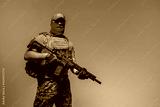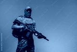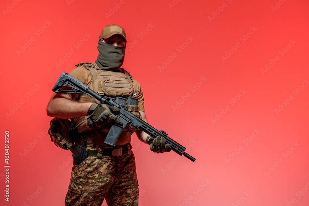 A soldier in military uniform holds a rifle AR 15 in his hands on red background in studio