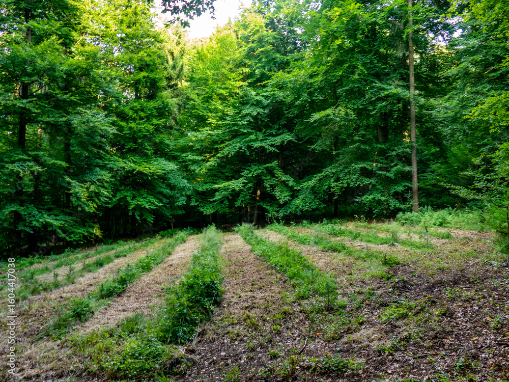 Wiederaufforstung im Mischwald im Sommer