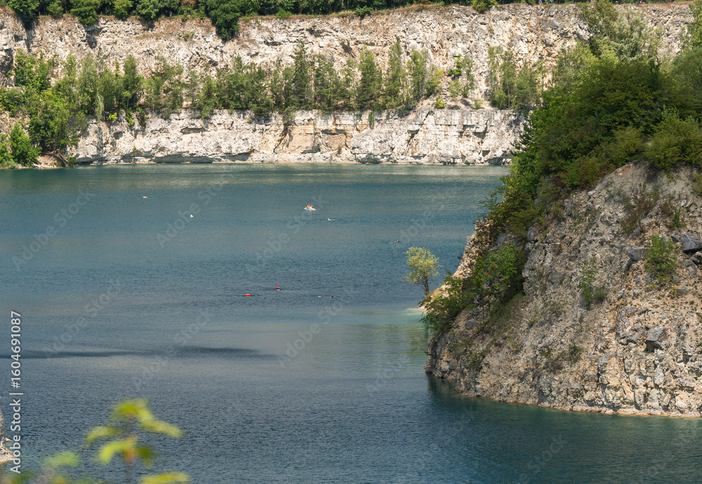 kąpielisko pośród skał wapiennych z błękitną wodą w letni słoneczny dzień