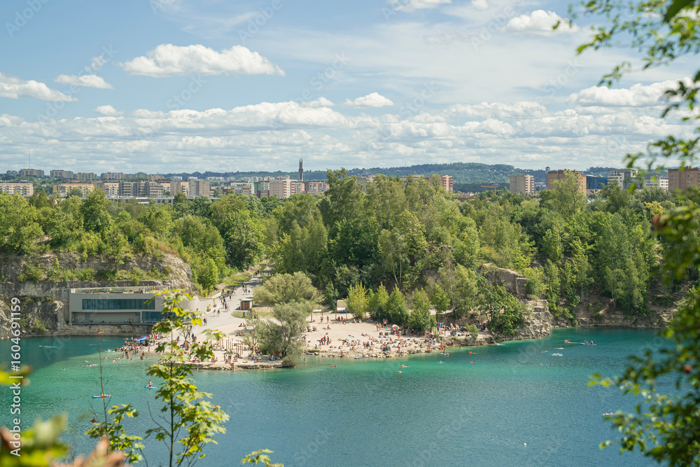kąpielisko pośród skał wapiennych z błękitną wodą w letni słoneczny dzień