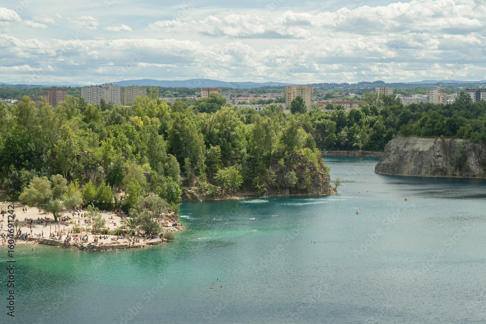 kąpielisko pośród skał wapiennych z błękitną wodą w letni słoneczny dzień