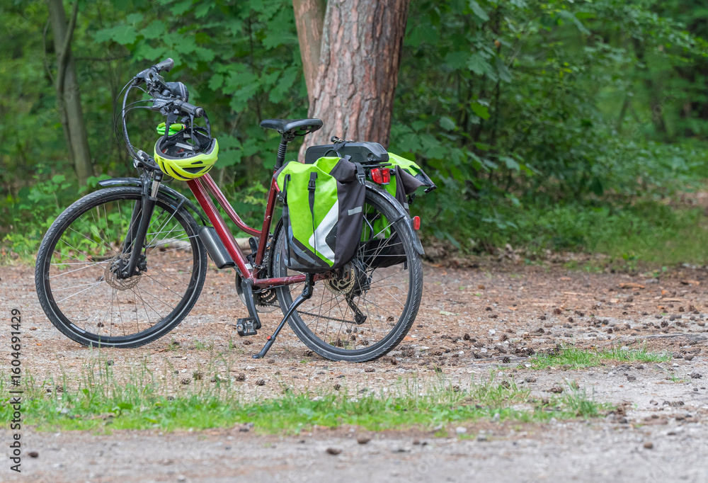 zaparkowany rower górski w lesie, z sakwami na bagażniku oraz zawieszonym kaskiem na kierownicy