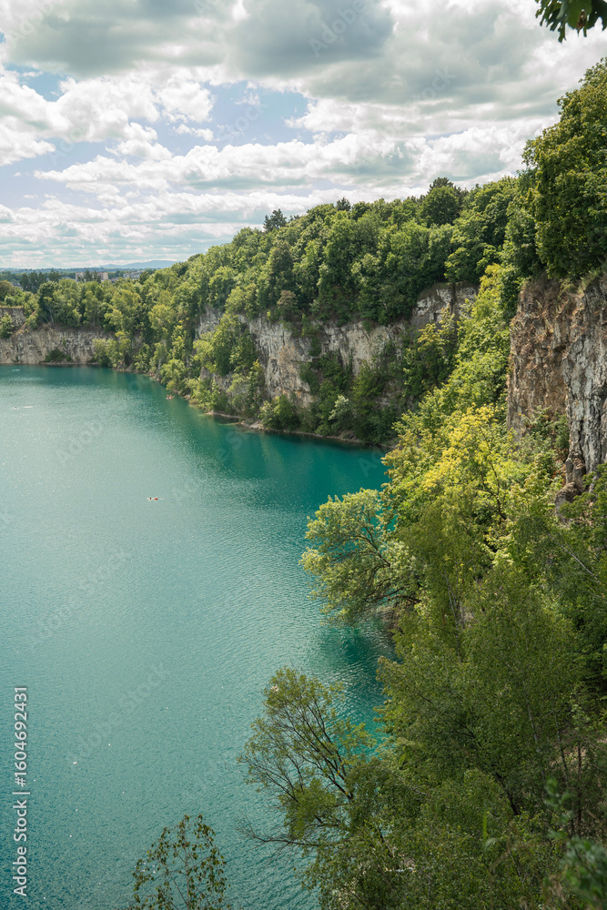 kąpielisko pośród skał wapiennych z błękitną wodą w letni słoneczny dzień