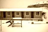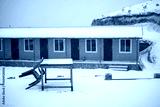 Wooden cabins in a snowy mountain region. An overturned plastic chair sits on a wooden table covered in fresh snow. Winter landscape with falling snow and overcast sky.