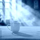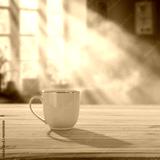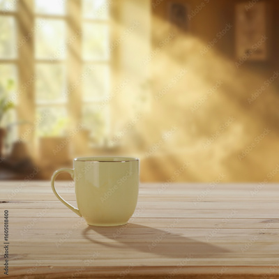 Cup on wooden table in bright kitchen interior with natural sunlight streaming through the window. Soft, cozy atmosphere, welcoming home space for placing a product or food display.