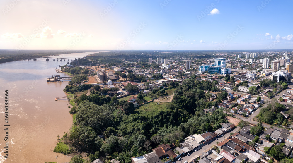 Beautiful aerial drone view of Porto Velho city center streets, buildings and Madeira river in the Amazon rainforest on sunny summer day. Rondonia state, Brazil.