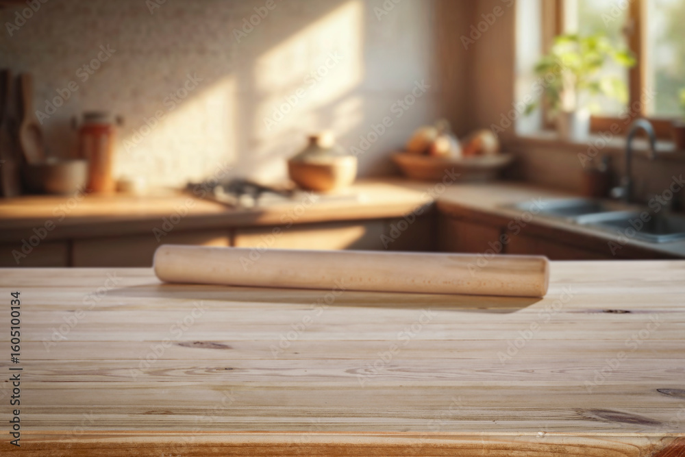 Wooden rolling pin on kitchen table in warm cozy kitchen interior filled with natural soft daylight streaming through the window. Rustic charm of home baking and culinary preparation. Copy space.