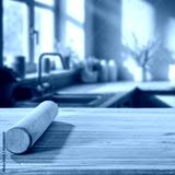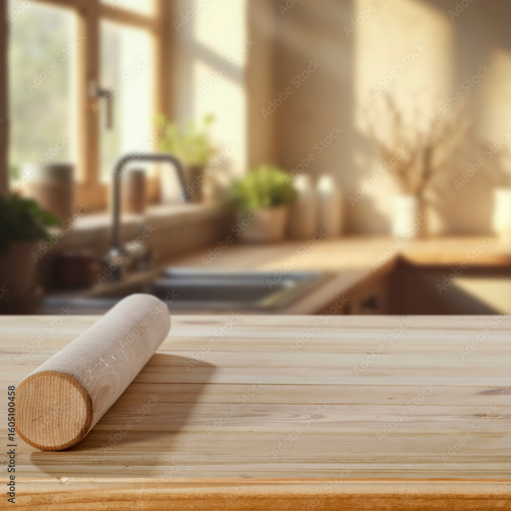 Wooden rolling pin on kitchen table in warm cozy kitchen interior filled with natural soft daylight streaming through the window. Rustic charm of home baking and culinary preparation. Copy space.