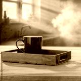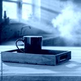 Mug on wooden tray on table in kitchen interior with natural sunlight streaming through the window. Soft, cozy atmosphere, welcoming home space for placing a product or food display.