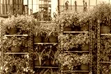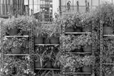 Potted plants in red containers are neatly arranged on metal shelves inside a greenhouse, forming an organized and green environment.
