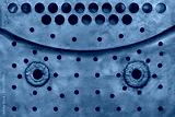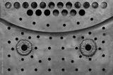 Close-up detail of weathered steam locomotive boiler showing metal construction with circular holes and aged patina. Industrial heritage machinery displaying authentic wear and craftsmanship.