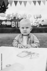 An adorable young child is enjoying an outdoor birthday celebration, joyfully surrounded by festive decorations and a vibrant, colorful banner that adds to the cheerful atmosphere of the event