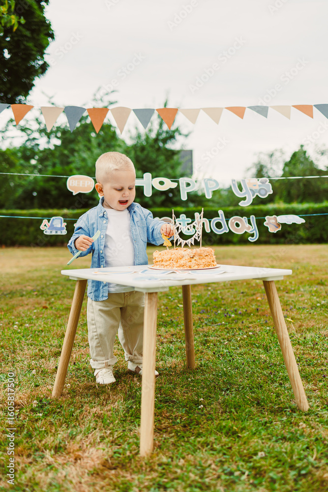 A young child joyfully celebrates their birthday outdoors with a cake adorned with candles and colorful bunting, creating a cheerful atmosphere filled with laughter and lasting memories