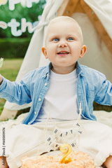 Joyful Celebration A Happy Child Enjoying a Birthday Party Out in the Fresh Air, Surrounded by Friends and Family, Filled with Laughter and Joyful Moments Under a Colorful Tent with Treats Galore