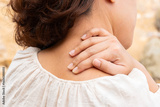 The woman had neck pain, shoulder pain, and Cervical Spondylosis sHe used her hands to massage the pain points of the muscles in her shoulders and neck. Medical concepts and treatments