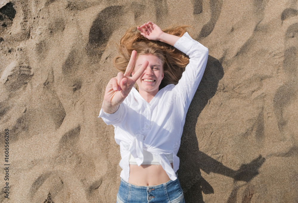 top view of young woman lying on sand enjoying vacation , showing peace gesture
