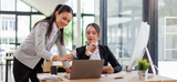 Business asian women Reviewing Documents, Two business meticulously reviewing a stack of documents, highlighting the details and precision in work.