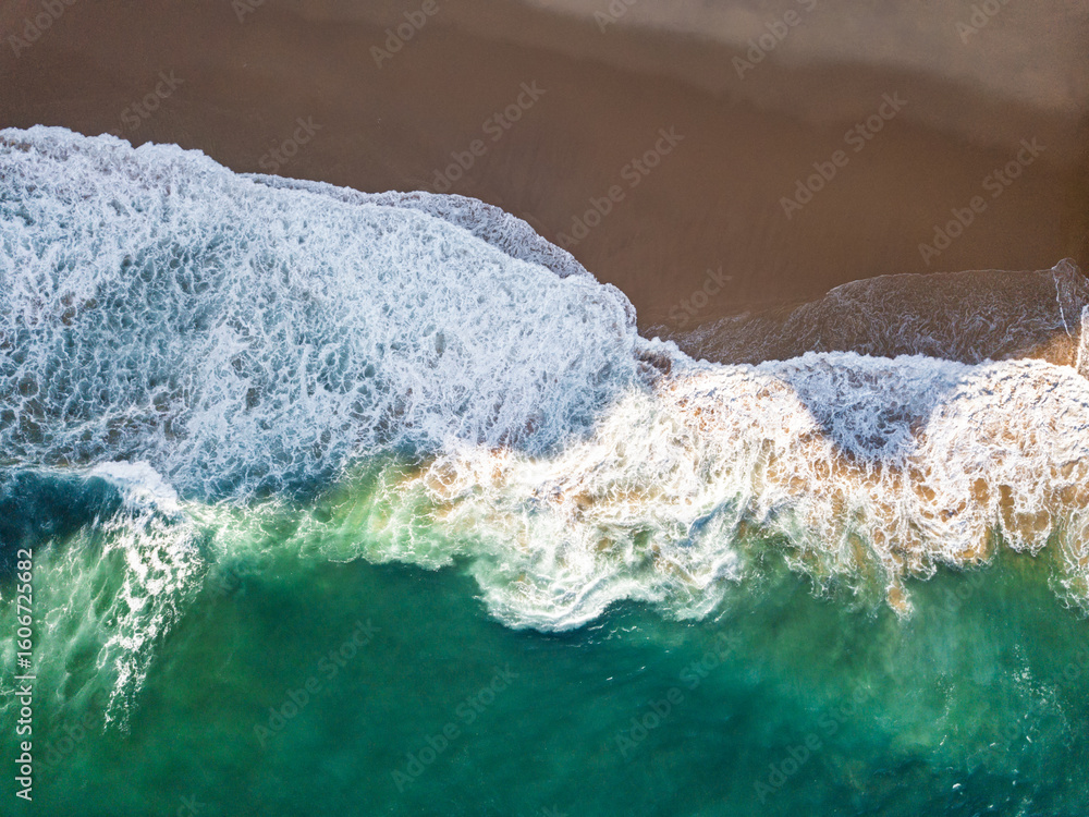 Aerial View of Ocean Waves Hitting Sandy Shore. Aerial drone view. natural background