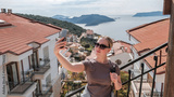 Woman enjoys solo travel, retreat and mindfulness sea, mountain, coast, marina; exploring slow adventure, freedom, calm, awareness, soft experience, relaxation, selfcare, youth lifestyle.
