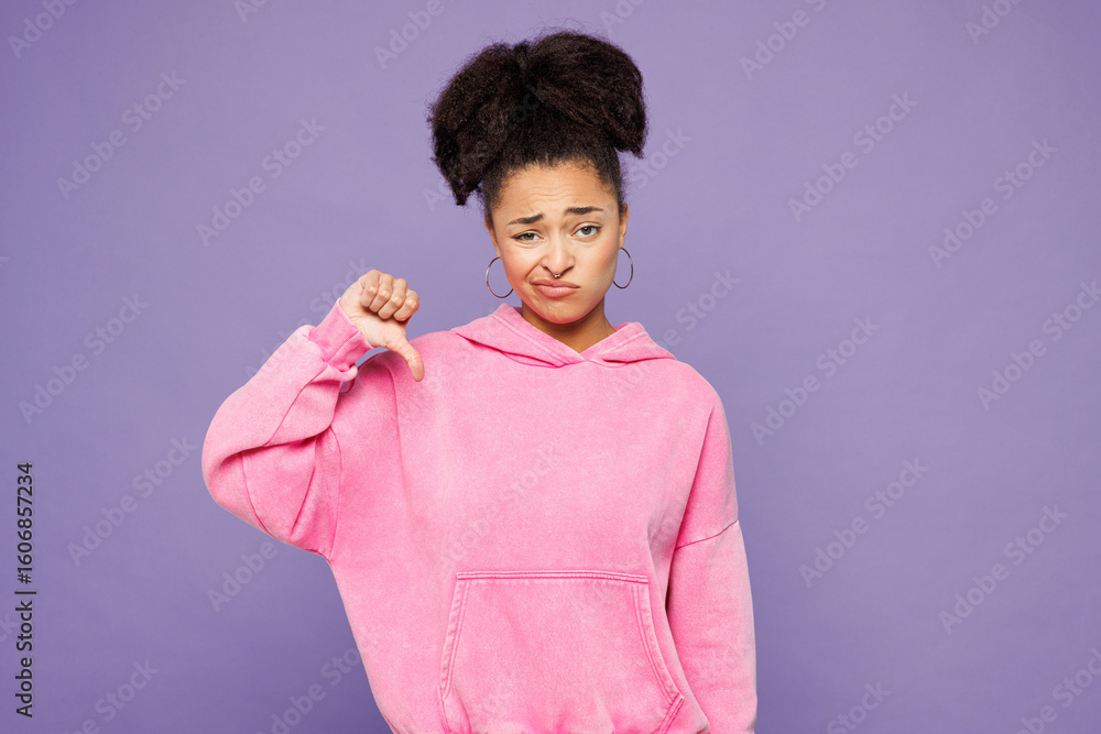 Young sad disappointed woman of African American ethnicity she wear pink hoodie casual clothes showing thumb down dislike gesture isolated on plain pastel light purple background. Lifestyle concept.