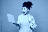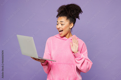 Young IT woman of African American ethnicity wear pink hoodie casual clothes hold use work on laptop pc computer waving hand talk speak isolated on plain pastel purple background. Lifestyle concept.