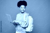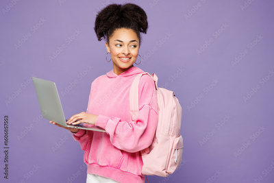 Young girl IT student she wear pink casual clothes backpack bag hold use work on laptop pc computer look aside isolated on plain pastel light purple background. High school university college concept.
