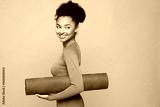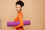 Side view young strong fitness trainer instructor sporty woman sportswoman wear orange clothes spend time in home gym hold yoga mat isolated on plain beige background. Workout sport fit abs concept.